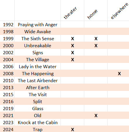 Anyway, even though I love or at least appreciate most of M Night's work (I didn't like The Happening but, to be fair, I only saw the last half), I'm startled to realize what big gaps I have in his filmography:
