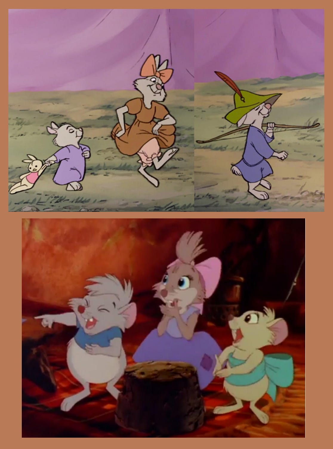 One of the reasons Bluth and other Disney animators left Disney is because they thought the Disney movies of the era were awful. But Robin Hood is the one that finally outraged them enough to beat it. What with those anthropomorphic animals and everything. But this movie's animals are . . . pretty anthropomorphic, even if they do live in a human world. And Mrs. Brisby's kids are verrrry much like Mother Rabit in Robin Hood. Not sure what to make of that.