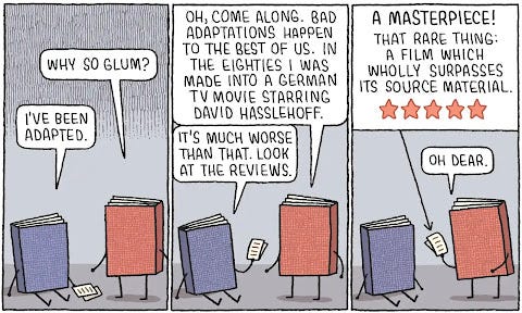 I don't really dig GRAPHIC NOVEL ADAPTATIONS, as a rule. I don't think there's anything wrong with it anymore than I think film adaptations are wrong. Adapt away! But most (not all) comics adaptations of novels I've read (or started reading) are lifeless and being "good for you" was the main goal. It started with the passion of a suit imaging selling it to schools and grandparents, not the passion of artists who love the story.